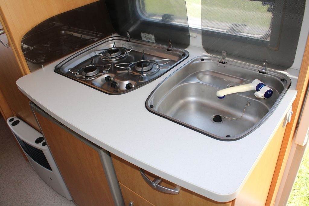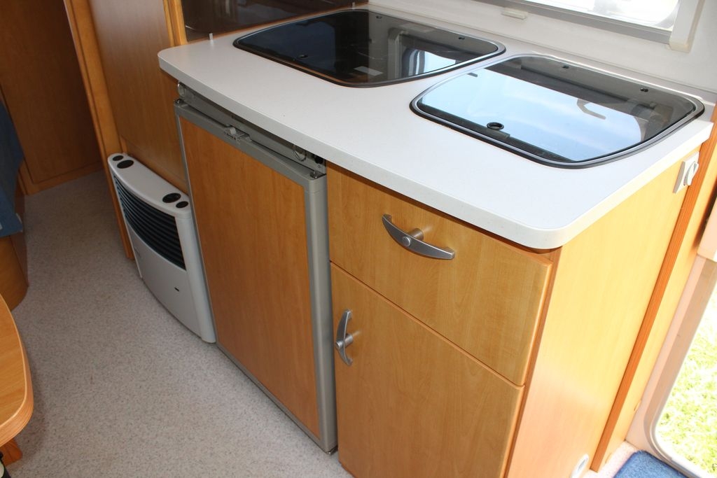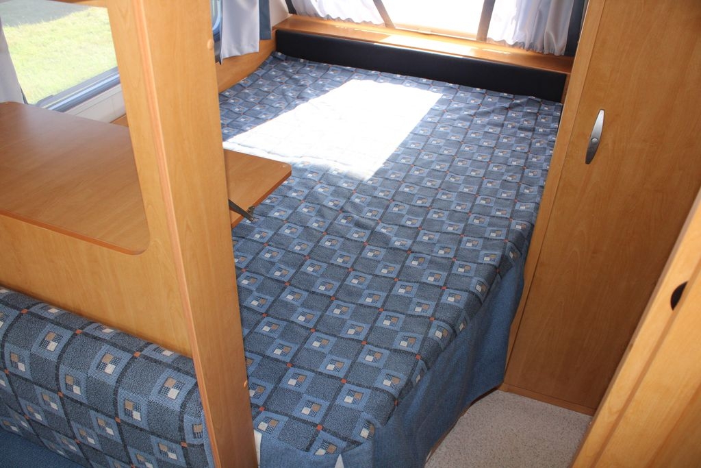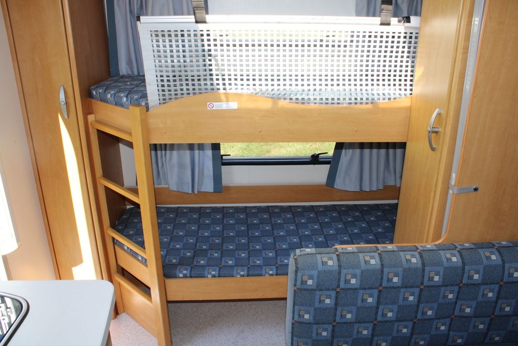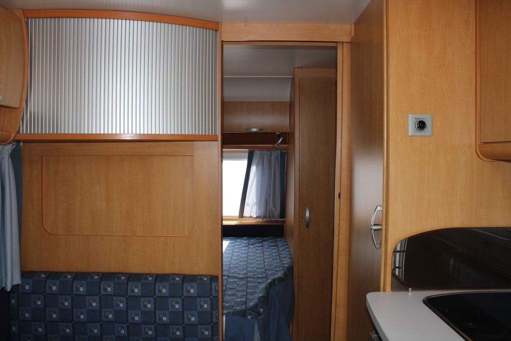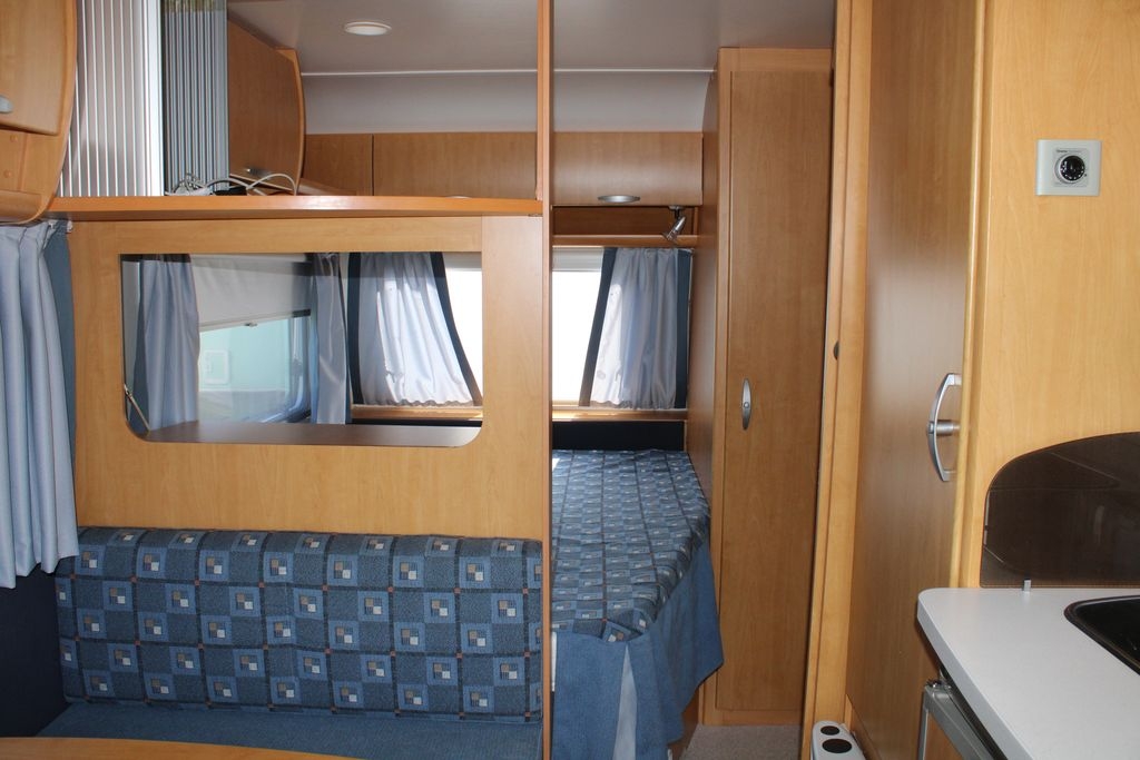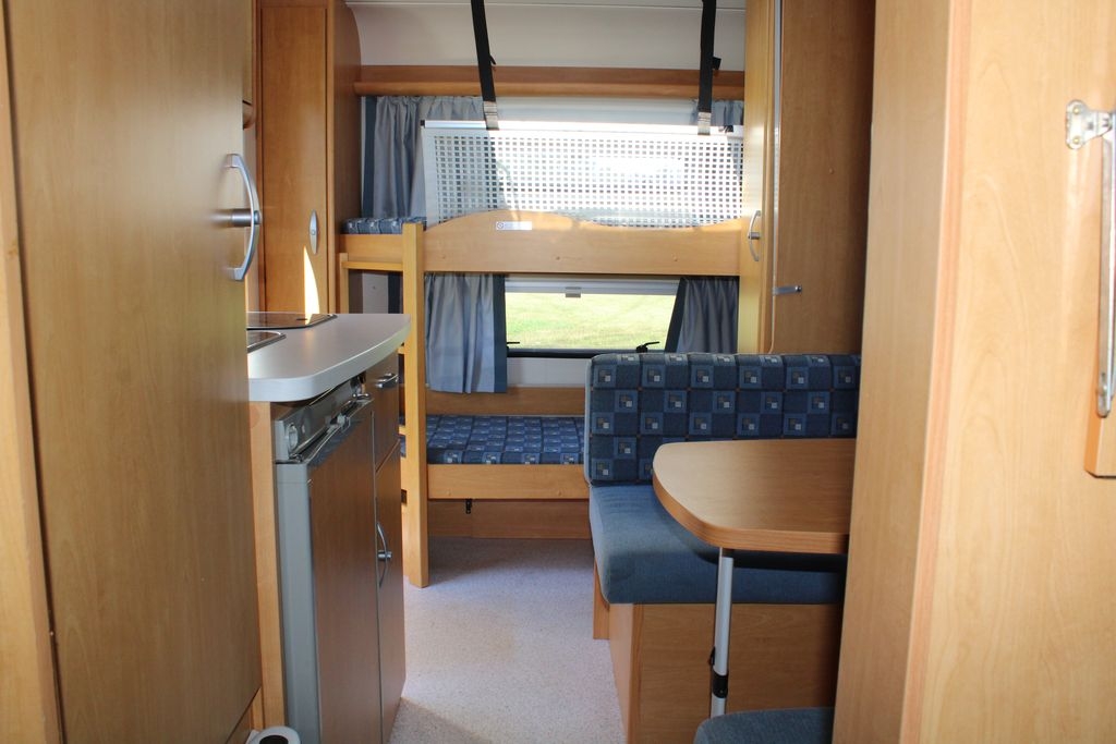 Z tyłu przyczepy znajduje się sypialnia z łóżkami piętrowymi o wymiarach 185 cm na 65 cm, wyposażonymi w solidną zabudowę oraz zamykana drzwiami typu harmonijka. W centralnej części znajduje się salon z opuszczanym stolikiem, który po rozłożeniu tworzy dodatkowe miejsce do spania o wymiarach 195 cm na 95 cm. Po prawej stronie drzwi wejściowych zlokalizowana jest funkcjonalna kuchnia ze zlewozmywakiem, kuchenką gazową, lodówką z zamrażalnikiem, szafkami, półkami i szufladą na sztućce, co czyni ją w pełni samowystarczalną.