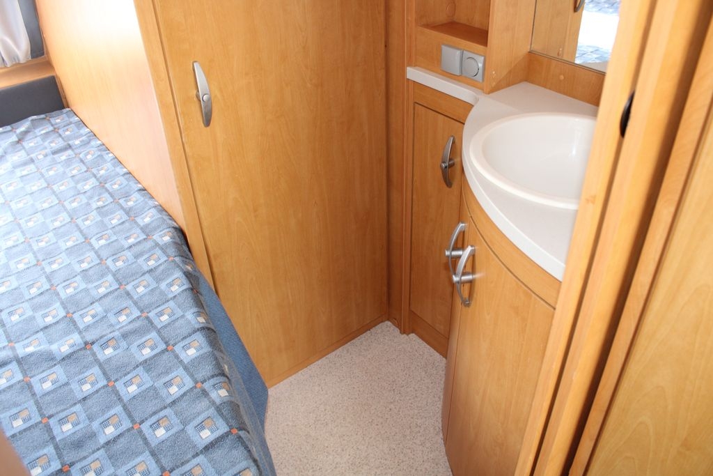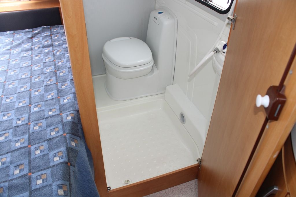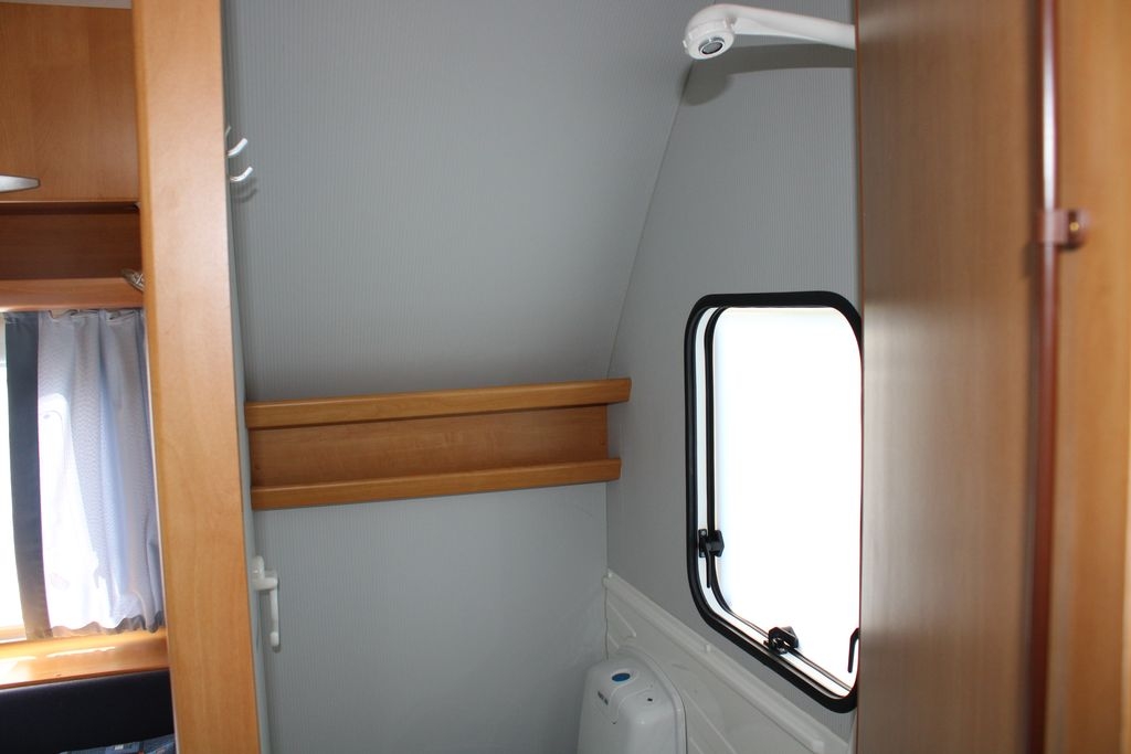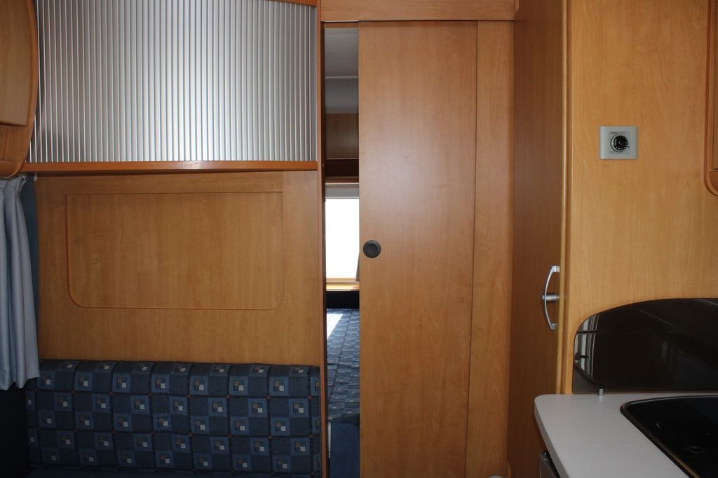 Wnętrze podzielone jest na strefy, zapewniając prywatność i wygodę dla wszystkich użytkowników. Z przodu znajduje się szerokie, stałe łoże o wymiarach 195 cm na 137 cm, zapewniające komfortowy sen. Obok zlokalizowana jest łazienka wyposażona w brodzik z prysznicem i toaletę kasetową, którą można opróżniać od zewnątrz. Przed wejściem do kabiny znajduje się oddzielna umywalka z szafkami i lustrami, oddzielona od reszty przyczepy drzwiami przesuwnymi oraz ścianką z zamykanymi półkami, co zapewnia prywatność i wygodny dostęp.