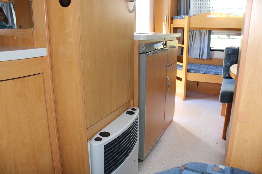 Obok kuchni znajduje się szafa ubraniowa z zamontowanym u dołu ogrzewaniem gazowym. W górnej części szafek i półek umieszczone jest oświetlenie, zapewniające komfort użytkowania. Wszystkie boczne okna wyposażone są w rolety przeciwsłoneczne z moskitierami, a moskitiera w drzwiach wejściowych chroni przed insektami.